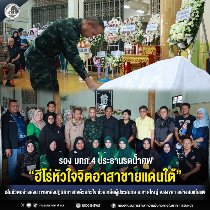 วันนี้ (1 ธันวาคม 2568) เวลา 14.00 น. ที่ศาลามูลนิธิแม่กอเหนี่ยวยะลา อำเภอเมือง จังหวัดยะลา พลตรี ชาคริต อุจะรัตน รองแม่ทัพภาคที่ 4 / รองผู้อำนวยการรักษาความมั่นคงภายในภาค 4 ส่วนหน้า เป็นประธานพิธีรดน้ำศพ และสดุดี “ฮีโร่หัวใจจิตอาสา”นายเชิดพงศ์ ปิยะวรรณางกูร หรือพี่โต ฉลามภัย 034 หนึ่งในสมาชิกกลุ่มเสื้อเขียว ทีมกู้ชีพฉลามภัย จังหวัดยะลา ซึ่งจากไปด้วยอาการสงบจากการปฏิบัติภารกิจด้วยหัวใจที่เปี่ยมล้นช่วยเหลือพี่น้องประชาชนผู้ประสบอุทกภัยที่อำเภอหาดใหญ่ จังหวัดสงขลา นับเป็นบุคคลที่สมควรแก่การยกย่อง เชิดชูเกียรติ ซึ่งเป็นผู้ที่ประพฤติดี มีคุณธรรม มีความซื่อสัตย์สุจริต รวมถึงการมีจิตสาธารณะและความเสียสละเพื่อส่วนรวม โดยมีผู้บังคับบัญชา , ผู้บังคับหน่วยเฉพาะกิจยะลา และหัวหน้าส่วนราชการ ทหาร ครอบครัว เพื่อนร่วมงานต่างร่วมแสดงความอาลัยจำนวนมาก