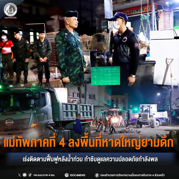 ทั้งนี้ แม่ทัพภาคที่ 4 ได้เน้นย้ำให้ทุกหน่วยคำนึงถึงความปลอดภัยของกำลังพลเป็นอันดับแรก โดยเฉพาะการดูแลสุขอนามัยเรื่องอาหารการกิน และการสวมถุงมือระหว่างปฏิบัติภารกิจทำความสะอาด เพื่อลดความเสี่ยงต่อการติดเชื้อจากน้ำและสิ่งปนเปื้อน พร้อมยืนยันว่ากองทัพภาคที่ 4 จะยังคงสนับสนุนการฟื้นฟูพื้นที่หาดใหญ่อย่างเต็มกำลัง จนกว่าสถานการณ์จะกลับสู่ภาวะปกติและประชาชนสามารถดำเนินชีวิตได้อย่างปลอดภัย