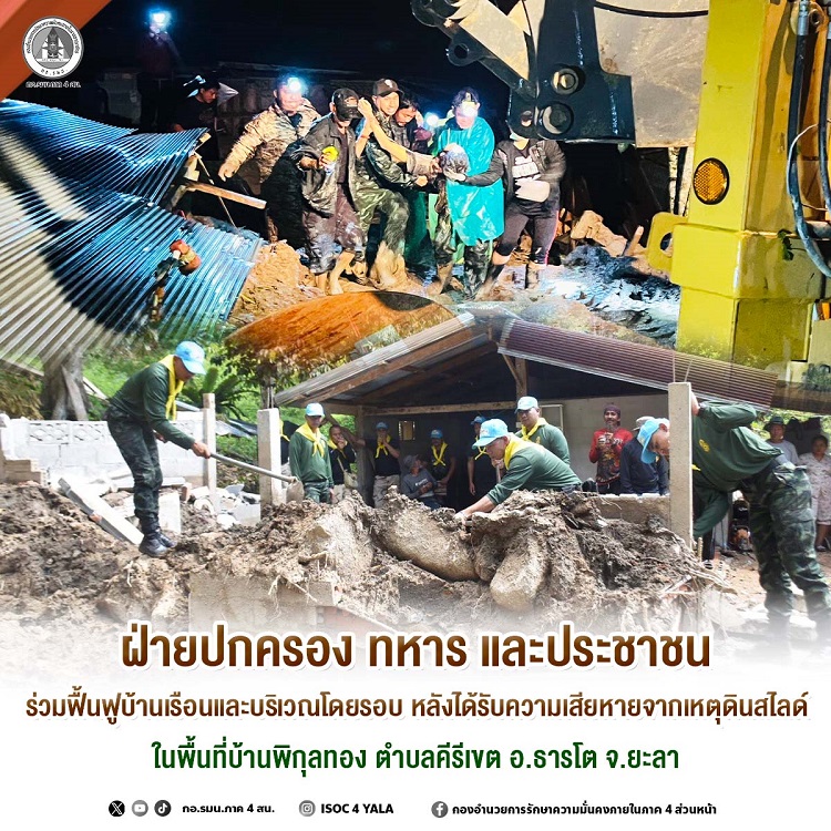 เมื่อวันที่ 3 ธันวาคม 2568 นายรุ่งโรจน์ สะท้าน นายอำเภอธารโต พร้อมด้วย พันโท อิสระพงศ์ บุญมา เป็นผู้บังคับกองพันทหารราบที่ 1 กรมทหารราบที่ 15 ค่ายพยัคฆ์ รวมถึง ผู้นำท้องที่ ท้องถิ่น จิตอาสา กำลังพลทั้งทหาร ตำรวจ และประชาชนในพื้นที่ ร่วมกิจกรรมทำความสะอาดและฟื้นฟูบ้านเรือนและบริเวณโดยรอบหลังเหตุการณ์ดินสไลด์ จากสถานการณ์ฝนตกหนักมากในพื้นที่อำเภอธารโต ของวันที่ (23 พฤศจิกายน 2568) ส่งผลให้เกิดเหตุดินสไลด์ทับบ้านเรือนประชาชน ณ บ้านเลขที่ 94 หมู่ที่ 1 บ้านพิกุลทอง ตำบลคีรีเขต อำเภอธารโต จังหวัดยะลา ซึ่งอยู่ติดเชิงเขา โดย นายรุ่งโรจน์ สะท้าน นายอำเภอธารโต พร้อมด้วยหน่วยงานที่เกี่ยวข้อง เข้าตรวจสอบและให้การช่วยเหลือ ภายในบ้านพบ นายสุภโชค แก้วทอง อายุ 22 ปี ถูกดินสไลด์ทับร่างเสียชีวิต และมีบ้านเรือนถูกดินสไลด์เสียหายทั้งหลัง พร้อมรถยนต์ 1 คัน และรถจักรยานยนต์อีก 1 คัน