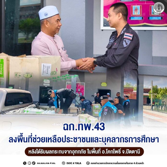 พ.อ.ชาญฤทธิ์ ฮันสราช ผบ.ฉก.ทพ.43 พร้อมคณะ ลงพื้นที่ ต.ป่าบอน อ.โคกโพธิ์ จ.ปัตตานี ตรวจเยี่ยมประชาชนที่ได้รับผลกระทบจากอุทกภัย พร้อมมอบสิ่งของอุปโภคบริโภคและยาสามัญให้ครูและนักเรียน โดยมีนายคอยา วาเลง ผู้บริหารโรงเรียนนาวาวิทย์ เป็นผู้รับมอบ ภารกิจนี้สะท้อนความห่วงใยของทหารพรานที่พร้อมยืนเคียงข้างประชาชนในยามวิกฤต เพื่อให้ชุมชนฟื้นตัวได้อย่างปลอดภัย