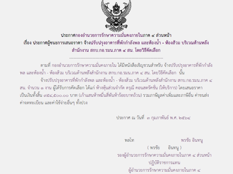 ประกาศผู้ชนะการเสนอราคา จ้างปรับปรุงอาคารที่พักกำลังพล และห้องน้ำ – ห้องส้วม บริเวณด้านหลังสำนักงาน สกบ.กอ.รมน.ภาค ๔ สน.โดยวิธีคัดเลือก (954,500.00)