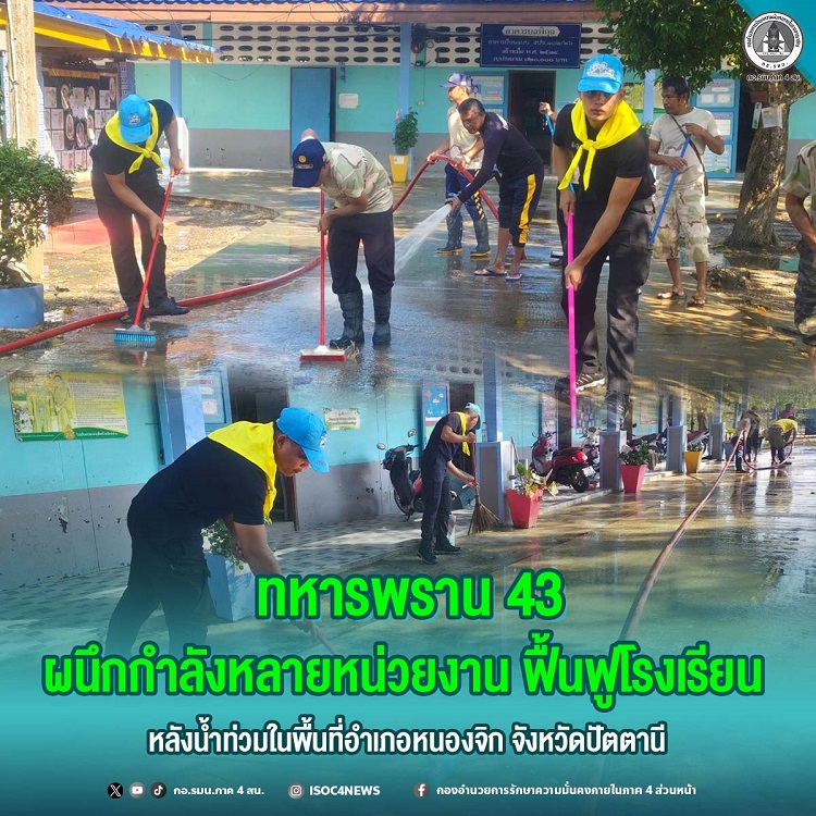 เมื่อวันที่ 2 ธันวาคม 2568 เวลา 08.00 น. กองร้อยทหารพรานที่ 4305 หน่วยเฉพาะกิจกรมทหารพรานที่ 43 ภายใต้การสั่งการของ พันเอก ชาญฤทธิ์ ฮันสราช ผู้บังคับหน่วยเฉพาะกิจกรมทหารพรานที่ 43 จัดกำลังพลชุดปฏิบัติการกิจการพลเรือน และกำลังพลจิตอาสา นำโดย ร้อยเอก สุดสายทิพย์ กาญจนเพ็ญ ผู้บังคับกองร้อยทหารพรานที่ 4305 ลงพื้นที่ร่วมกับ ศูนย์ปฏิบัติการอำเภอหนองจิก, สมาชิกกองอาสารักษาดินแดน ชุดคุ้มครองตำบลตุยง และ บุคลากรทางการศึกษา 12 คน เพื่อทำความสะอาดและฟื้นฟู โรงเรียนประชาอุทิศบ้านโคกม่วง หมู่ที่ 7 ตำบลตุยง อำเภอหนองจิก จังหวัดปัตตานี หลังสถานการณ์น้ำท่วมคลี่คลาย