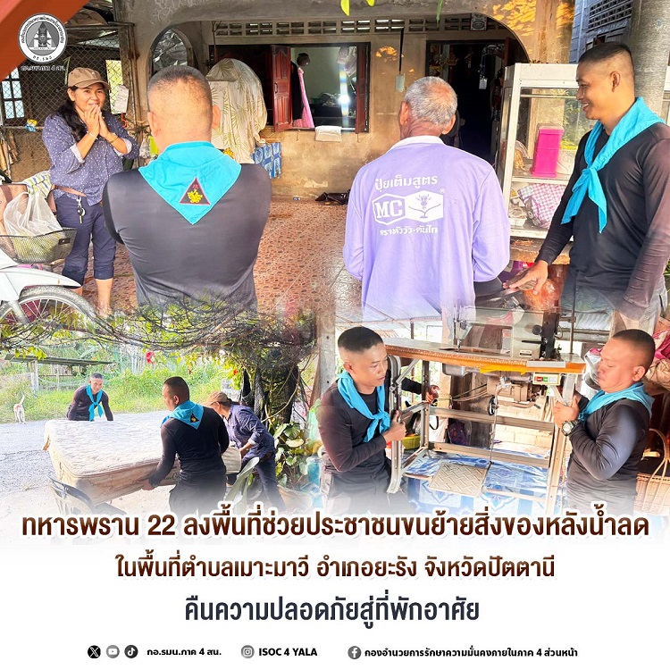 เมื่อวันที่ 2 ธันวาคม 2568 เวลา 13.30 น. กองร้อยทหารพรานที่ 2204 หน่วยเฉพาะกิจกรมทหารพรานที่ 22 จัดกำลังพล ชุดปฏิบัติการกิจการพลเรือน (ชป.กร.) ลงพื้นที่ให้การช่วยเหลือประชาชนใน บ้านม่วงหมัง หมู่ที่ 5 ตำบลเมาะมาวี อำเภอยะรัง จังหวัดปัตตานี หลังสถานการณ์น้ำท่วมในพื้นที่เริ่มคลี่คลายและระดับน้ำลดลงเข้าสู่ภาวะปกติ โดยเจ้าหน้าที่ทหารพรานได้ร่วมมือกันทำการขนย้ายสิ่งของจากที่สูงลงมาสู่พื้นที่พักอาศัย เพื่อให้ประชาชนสามารถกลับเข้าที่พักได้อย่างปลอดภัยและสะดวกมากขึ้น เป็นการบรรเทาความเดือดร้อนเบื้องต้นหลังผ่านพ้นภาวะวิกฤตน้ำท่วม