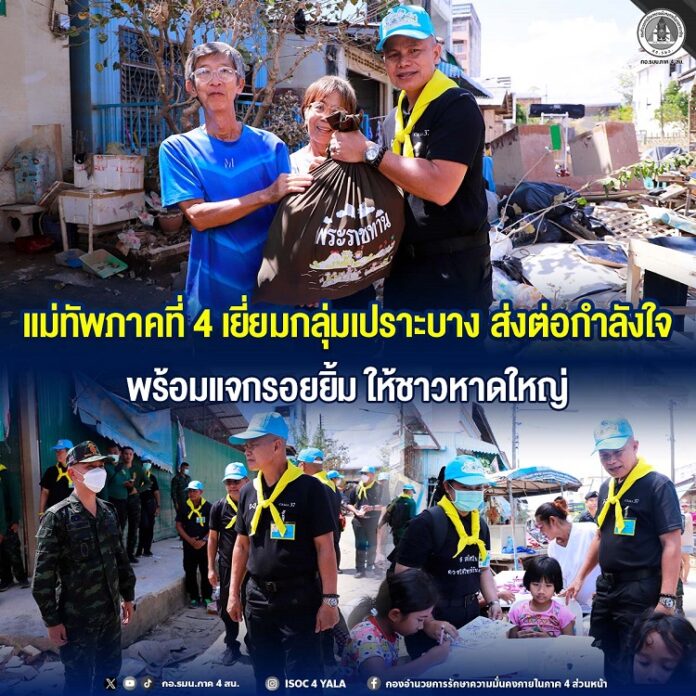 วันที่ 3 ธันวาคม 2568 เวลา 12.00 น. พลโท นรธิป โพยนอก แม่ทัพภาคที่ 4 / ผู้อำนวยการศูนย์บรรเทาสาธารณภัย กองทัพภาคที่ 4 ส่วนหน้า ได้เดินทางลงพื้นที่เยี่ยมเยียนและให้กำลังใจ กลุ่มเปราะบาง ในพื้นที่ ถนนโชคสมาน 5 ชุมชนหลังสถานีรถไฟ อำเภอหาดใหญ่ จังหวัดสงขลา การลงพื้นที่ครั้งนี้เป็นส่วนหนึ่งของภารกิจ ”4 คืน“ คือการคืนความสุขให้แก่ประชาชนหลังประสบอุทกภัย