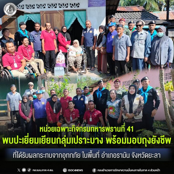เมื่อวันที่ 3 ธันวาคม 2568 เวลา 09.00 น. หน่วยเฉพาะกิจกรมทหารพรานที่ 41 จัดกำลังพลชุดปฏิบัติการกิจการพลเรือน กองร้อยทหารพรานที่ 4113 ร่วมกับศูนย์พัฒนาศักยภาพคนพิการประจำชุมชนรามัน, ชุดทักษิณสัมพันธ์ 953, ผู้นำชุมชน, ชุดคุ้มครองตำบลเนินงาม และบัณฑิตอาสา ลงพื้นที่พบปะเยี่ยมเยียนประชาชนกลุ่มเปราะบาง (ผู้ป่วยติดเตียง) ที่ได้รับผลกระทบจากสถานการณ์อุทกภัยที่ผ่านมา จำนวน 6 ครัวเรือน พร้อมมอบถุงยังชีพ ตลอดจนพูดคุยให้กำลังใจ และหารือแนวทางในการช่วยเหลือเพื่อฟื้นฟูคุณภาพชีวิตให้ดีขึ้นอย่างต่อเนื่อง