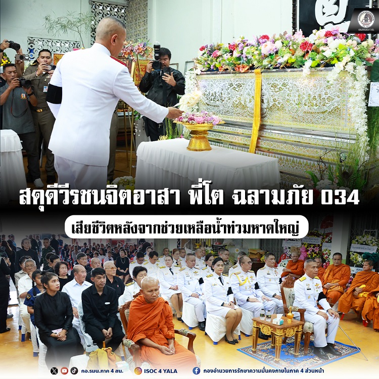 วันนี้ (4 ธันวาคม 2568) เวลา 14.00 น. ณ ศาลามูลนิธิแม่กอเหนี่ยวยะลา อำเภอเมือง จังหวัดยะลา พลตรี กฤศ ศรีเดชาสินธุ์ รองผู้อำนวยการรักษาความมั่นคงภายในภาค 4 ส่วนหน้า เป็นประธานในพิธีพระราชทานเพลิงศพ นายเชิดพงศ์ ปิยะวรรณางกูร จิตอาสากู้ชีพฉลามภัย และสมาชิกกลุ่มเสื้อเขียว จังหวัดยะลา ซึ่งเสียชีวิต เนื่องจากล้มป่วยกะทันหันจากภาวะหัวใจวาย ขณะกลับจากภารกิจช่วยอุทกภัย อำเภอหาดใหญ่ จังหวัดสงขลา เมื่อวันที่ 28 พฤศจิกายน 2568 ที่ผ่านมา โดยมี คณะผู้บังคับบัญชา ผู้บังคับหน่วยเฉพาะกิจยะลา หัวหน้าส่วนราชการ ทหาร ตำรวจ ครอบครัว ญาติ เพื่อนร่วมงานและประชาชน เข้าร่วมพิธีและร่วมไว้อาลัยเป็นจำนวนมาก