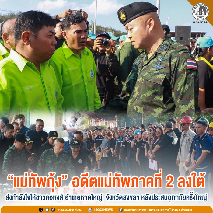 วันนี้ (5 ธันวาคม 2568 ) เวลา 08.00 น. พลโท บุญสิน พาดกลาง ที่ปรึกษาผู้บัญชาการทหารบกและอดีตแม่ทัพภาคที่ 2 พร้อมคณะฯ เดินทางลงใต้เยี่ยมเยียนให้กำลังใจเจ้าหน้าที่ จิตอาสา ประชาชนชาวคอหงส์ ณ สำนักงานเทศบาลเมืองคอหงส์ อำเภอหาดใหญ่ จังหวัดสงขลา โดยได้ร่วมร้องเพลงชาติไทยและเพลงสรรเสริญพระบารมี และร่วมแพคถุงยังชีพ เพื่อแจกจ่ายไปยังพี่น้องประชาชนผู้ประสบอุทกภัยในพื้นที่ โดยมี นายทวีศักดิ์ ทวีรัตน์ นายกเทศมนตรีเมืองคอหงส์ ,นายศุภชัย ลิ้มพิพัฒนโสภณ นายกสมาคมศิษย์เก่าอุเทนถวาย ตลอดจนสมาชิกสมาคมศิษย์เก่ายุพินถวายหาดใหญ่ จิตอาสา 905 การไฟฟ้าส่วนภูมิภาค และชุดกองพันซ่อมบำรุง กรมสนับสนุน กองพลทหารราบที่ 15 ร่วมให้การต้อนรับ