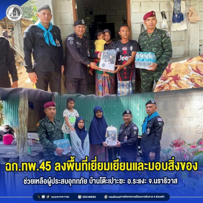 เมื่อวันที่ 5 ธันวาคม 2568 เวลา 09.00 น. หน่วยเฉพาะกิจกรมทหารพรานที่ 45 นำโดย ร้อยตรี ธนวัฒน์ สุวรรณา ผู้บังคับกองร้อยทหารพรานที่ 4502 และหัวหน้าชุดประชาสัมพันธ์ พร้อมด้วย ชุดสันติสุข 954, ชุดกิจการมวลชนกองร้อยทหารพรานที่ 4502, ผู้นำหมู่บ้าน และอาสาสมัครประจำพื้นที่ ลงพื้นที่บ้านโต๊ะเปาะฆะ หมู่ที่ 10 ตำบลตันหยงมัส อำเภอระแงะ จังหวัดนราธิวาส เพื่อพบปะเยี่ยมเยียนประชาชน พร้อมทั้งสร้างความเข้าใจและให้กำลังใจประชาชนที่ได้รับผลกระทบจากอุทกภัยในช่วงที่ผ่านมา รวมถึงรับฟังปัญหา ความต้องการ และข้อเสนอแนะจากชาวบ้านโดยตรง เพื่อให้หน่วยงานที่เกี่ยวข้องสามารถวางแผนให้ความช่วยเหลือได้ตรงจุดและทันท่วงที