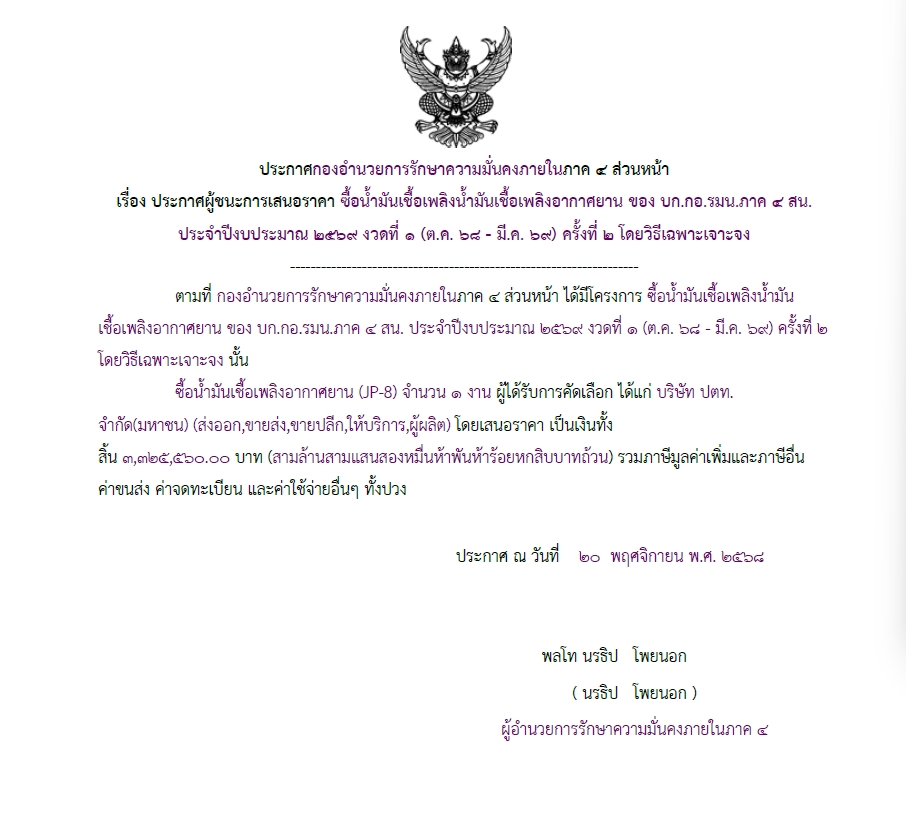 จัดซื้อ จัดจ้างประกาศผู้ชนะการเสนอราคา ประกาศผู้ชนะการเสนอราคา ซื้อน้ำมันเชื้อเพลิงน้ำมันเชื้อเพลิงอากาศยาน ของ บก.กอ.รมน.ภาค ๔ สน. ประจำปีงบประมาณ ๒๕๖๙ งวดที่ ๑ (ต.ค. ๖๘ – มี.ค. ๖๙) ครั้งที่ ๒ โดยวิธีเฉพาะเจาะจง December 6, 2025 6 Share Facebook Twitter Google+ Telegram LINE