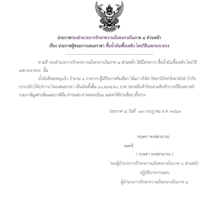 ประกาศผู้ชนะการเสนอราคา ซื้อน้ำมันเชื้อเพลิง โดยวิธีเฉพาะเจาะจง(๗)