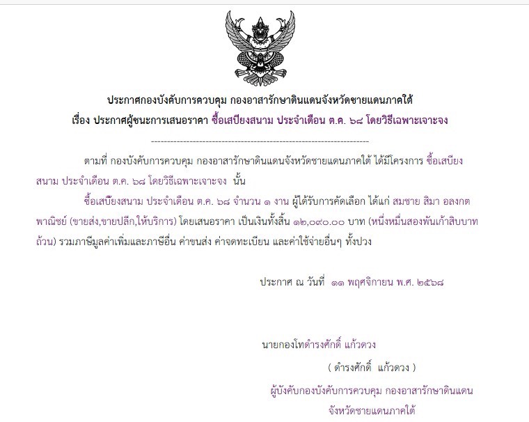 จัดซื้อ จัดจ้างประกาศผู้ชนะการเสนอราคา ประกาศกองบังคับการควบคุม กองอาสารักษาดินแดนจังหวัดชายแดนภาคใต้ เรื่อง ประกาศผู้ชนะการเสนอราคา ซื้อเสบียงสนาม ประจำเดือน ต.ค. ๖๘ โดยวิธีเฉพาะเจาะจง December 7, 2025 9 Share Facebook Twitter Google+ Telegram LINE