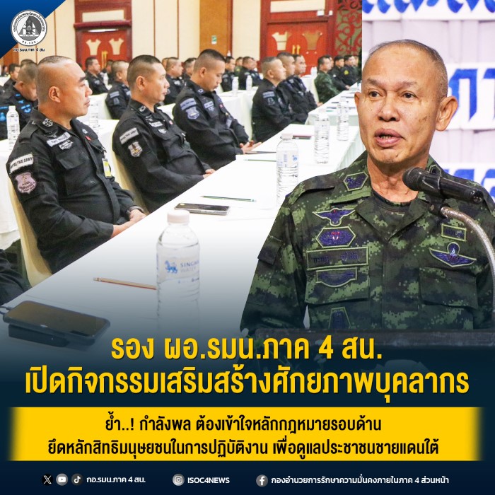 วันนี้ ( 8 ธันวาคม 2568 ) เวลา 10.00 น. ที่โรงแรมบีพี สมิหลา บีช รีสอร์ท อำเภอเมือง จังหวัดสงขลา พลตรี กรกฎ ภู่โชติ รองผู้อำนวยการรักษาความมั่นคงภายในภาค 4 ส่วนหน้า เปิดกิจกรรมเสริมสร้างศักยภาพบุคลากรเป็นชุดปฏิบัติการถ่ายทอดพระราชบัญญัติการรักษาความมั่นคงภายในราชอาณาจักร พ.ศ.2551 ประจำปีงบประมาณ 2569 โดยสำนักกฎหมายและสิทธิมนุษยชน กองอำนวยการรักษาความมั่นคงภายในภาค 4 ส่วนหน้า ดำเนินกิจกรรมเน้นเพิ่มความรู้แก่กำลังพลที่ปฏิบัติภารกิจในพื้นที่จังหวัดชายแดนภาคใต้ สามารถถ่ายทอดความรู้เกี่ยวกับกฎหมายความมั่นคงทั้ง 3 ฉบับ ที่มีการบังคับใช้ในพื้นที่ให้เกิดความชำนาญ และปฏิบัติภารกิจได้อย่างมีประสิทธิภาพสูงสุด แบ่งออกเป็น 3 กิจกรรม คือ รับฟังบรรยายพิเศษจากวิทยากรผู้ทรงคุณวุฒิ , แบ่งกลุ่มให้ผู้รับการอบรมได้แถลงแลกเปลี่ยนประสบการณ์ในการฝึกปฏิบัติ และฝึกการเป็นวิทยากรในการนำเสนอความรู้ที่ได้รับนำไปถ่ายทอดอย่างมีประสิทธิภาพ