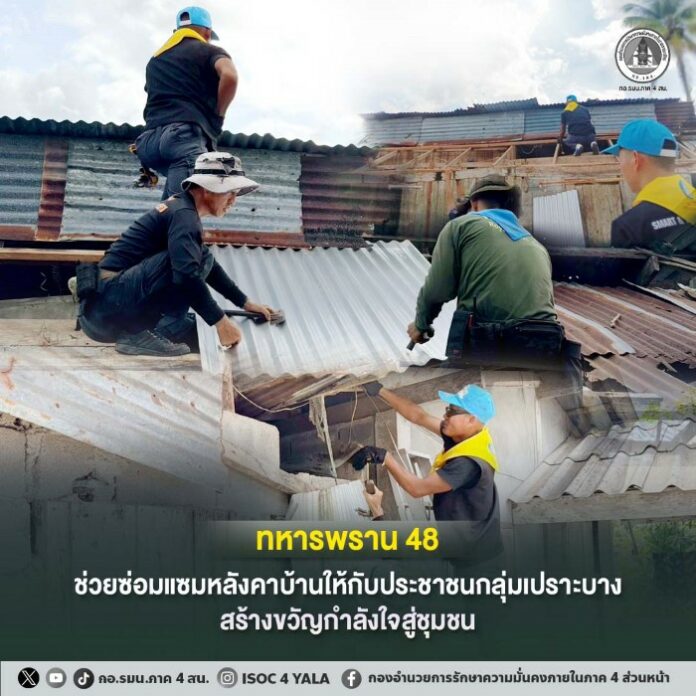วันที่ 9 ธันวาคม 2568 หน่วยเฉพาะกิจกรมทหารพรานที่ 48 ได้ดำเนินการโครงการ “ภารกิจปิดรอยรั่ว” โดยสนับสนุนงบประมาณในการจัดซื้อหลังคาสังกะสี พร้อมทั้งจัดกำลังพลชุดช่างจากกองร้อยทหารพรานที่ 4813 ร่วมกับเจ้าหน้าที่ชุดคุ้มครองตำบล และประชาชนจิตอาสาในพื้นที่ เพื่อช่วยกันซ่อมแซมหลังคาบ้านของประชาชนกลุ่มเปราะบาง (ผู้สูงอายุ) ที่ชำรุดผุพัง จำนวน 6 หลัง ในพื้นที่ตำบลโต๊ะเด็ง อำเภอสุไหงปาดี จังหวัดนราธิวาส เพื่อบรรเทาความเดือดร้อน และเป็นการพัฒนาคุณภาพชีวิตของประชาชนในพื้นที่ให้มีความเป็นอยู่ที่ดีขึ้น โดยเฉพาะกลุ่มที่อาจจะไม่ได้รับการดูแลอย่างทั่วถึง สร้างความหวังและขวัญกำลังใจให้กับชุมชนท้องถิ่น ทั้งยังเป็นการเสริมสร้างความสัมพันธ์อันดีระหว่างประชาชนและหน่วยงานภาครัฐ