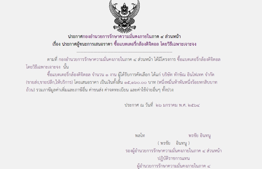 ประกาศผู้ชนะการเสนอราคา ซื้อแบตเตอรี่กล้องดิจิตอล โดยวิธีเฉพาะเจาะจง ( ๑๕,๑๖๐.๐๐ บาท )