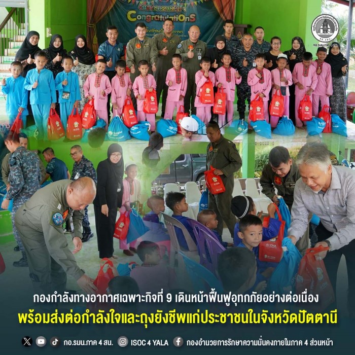 วันที่ 12 ธันวาคม 2568 นาวาอากาศเอก รัชต์ภาคย์ ธรรมธีรศรี ผู้บังคับการกองกำลังทางอากาศเฉพาะกิจที่ 9 มอบหมายให้ นาวาอากาศเอก สุทธิชัย ศรีทองอุทัย รองเสนาธิการฯ นำกำลังพลลงพื้นที่มอบถุงยังชีพจากภาคีเครือข่ายและผู้มีจิตศรัทธา ผ่านศูนย์บรรเทาสาธารณภัย กองทัพอากาศ เพื่อบรรเทาความเดือดร้อนของประชาชนผู้ประสบอุทกภัยในจังหวัดปัตตานี