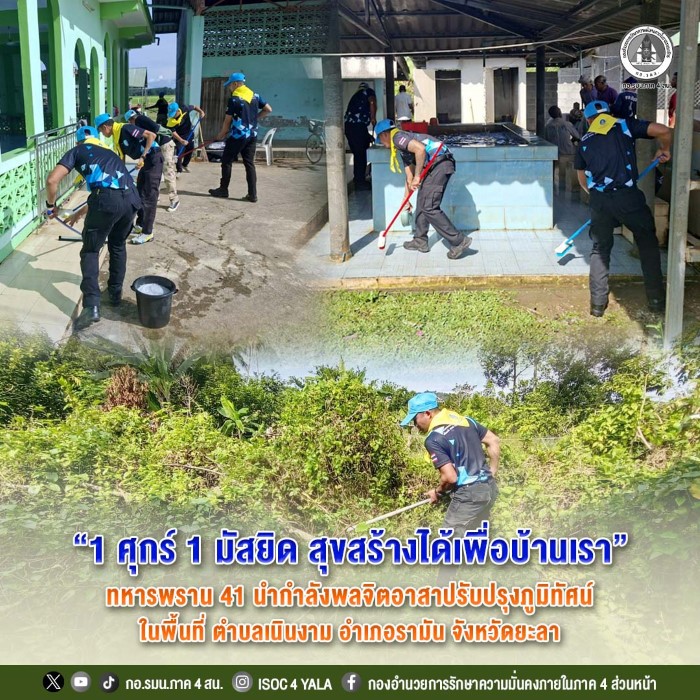 วันที่ 12 ธันวาคม 2568 เวลา 09.00 น. หน่วยเฉพาะกิจกรมทหารพรานที่ 41 จัดกำลังพลจิตอาสา กองร้อยทหารพรานที่ 4113 หน่วยเฉพาะกิจกรมทหารพรานที่ 41 ร่วมกับปลัดตำบลเนินงาม, ผู้นำชุมชน และ อาสาสมัครชุดคุ้มครองตำบลเนินงาม ร่วมกิจกรรมจิตอาสา “1 ศุกร์ 1 มัสยิด สุขสร้างได้เพื่อบ้านเรา” โดยการพัฒนาทำความสะอาด ปรับปรุงภูมิทัศน์ เพื่อถวายเป็นพระราชกุศล แด่สมเด็จพระนางเจ้าสิริกิติ์ พระบรมราชินีนาถ พระบรมราชชนนีพันปีหลวง ณ มัสยิดบ้านบือดอง หมู่ที่ 4 บ้านบือดอง ตำบลเนินงาม อำเภอรามัน จังหวัดยะลา
