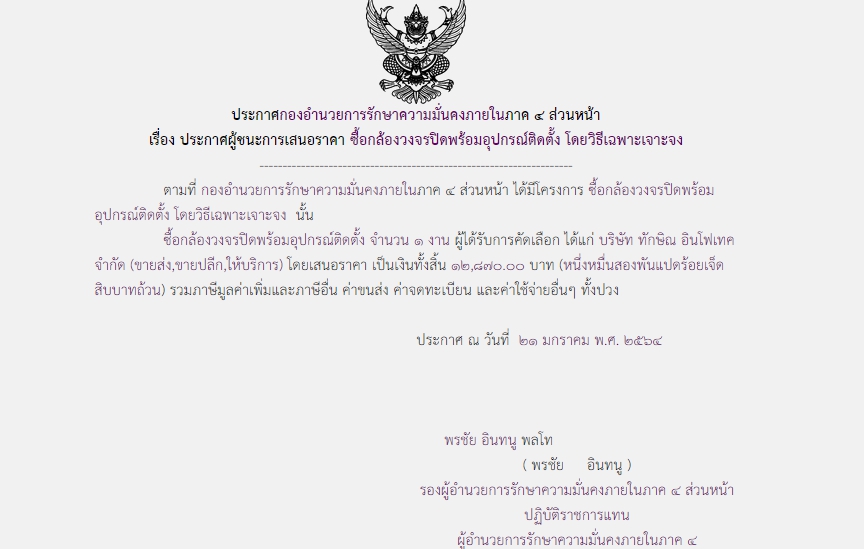จัดซื้อ จัดจ้างประกาศผู้ชนะการเสนอราคา ประกาศผู้ชนะการเสนอราคา ซื้อกล้องวงจรปิดพร้อมอุปกรณ์ติดตั้ง โดยวิธีเฉพาะเจาะจง ( ๑๒,๘๗๐.๐๐ บาท ) February 4, 2021 934 Share Facebook Twitter Google+ Telegram LINE กอ.รมน.ภาค ๔ สน.