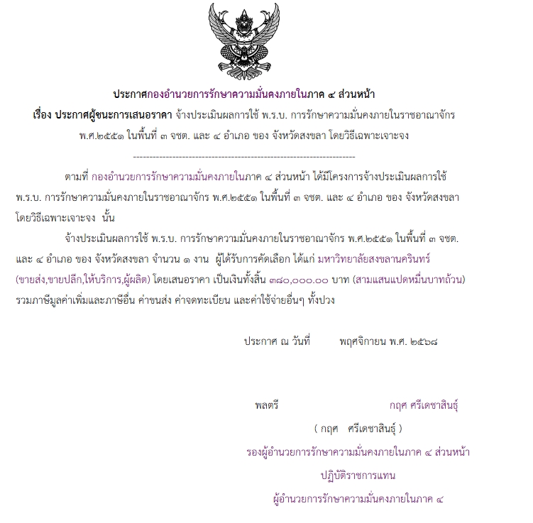 จัดซื้อ จัดจ้างประกาศผู้ชนะการเสนอราคา ประกาศผู้ชนะการเสนอราคา จ้างการประเมินผลการใช้ พ.ร.บ. การรักษาความมั่นคงภายในราชอาณาจักร พ.ศ.๒๕๕๑ ในพื้นที่ ๓ จชต. และ ๔ อำเภอ ของ จังหวัดสงขลา โดยวิธีเฉพาะเจาะจง December 13, 2025 10 Share Facebook Twitter Google+ Telegram LINE