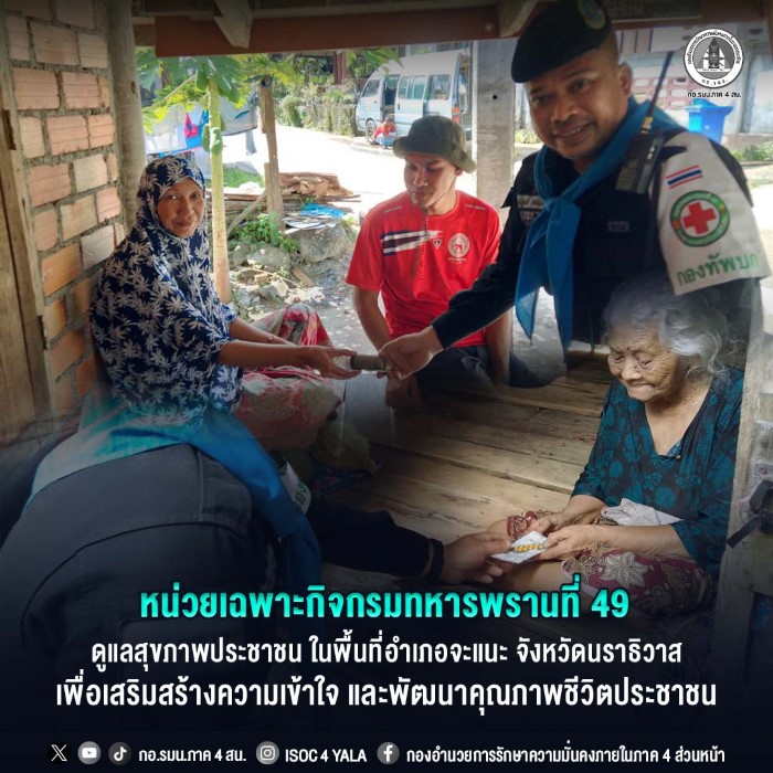 เมื่อวันที่ 13 ธันวาคม 2568 เวลา 10.30 น. หน่วยเฉพาะกิจกรมทหารพรานที่ 49 จัดกำลังพล ชุดแพทย์เคลื่อนที่ หรือ “หมอเดินเท้า” ร่วมกับผู้ช่วยผู้ใหญ่บ้าน หมู่ที่ 7 เข้าพบปะเยี่ยมเยียนประชาชนในพื้นที่บ้านตือกอ หมู่ที่ 7 ตำบลจะแนะ อำเภอจะแนะ จังหวัดนราธิวาส เพื่อพูดคุยสอบถามถึงความเป็นอยู่ ปัญหาด้านสุขภาพของสมาชิกในครอบครัว ตลอดจนรับฟังความคิดเห็น ข้อเสนอแนะ และความต้องการของประชาชน เพื่อนำข้อมูลไปใช้ในการดูแลช่วยเหลือและพัฒนาคุณภาพชีวิตของประชาชนให้ดียิ่งขึ้นอย่างเหมาะสมและยั่งยืน