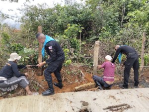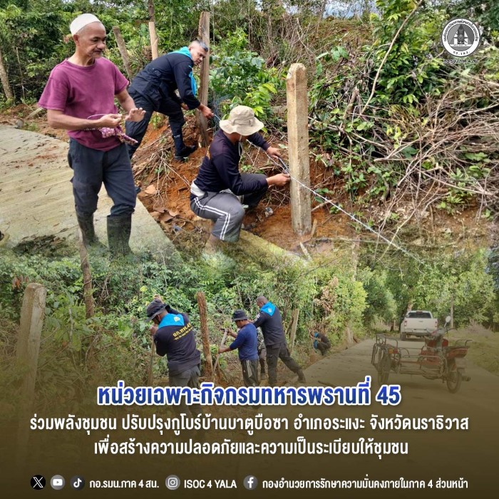 เมื่อวันที่ 13 ธันวาคม 2568 เวลา 09.00 น. หน่วยเฉพาะกิจกรมทหารพรานที่ 45 จัดกำลังพลชุดปฏิบัติการกิจการพลเรือน ร่วมกับผู้นำท้องที่ ผู้นำศาสนา และประชาชนในพื้นที่ ร่วมแรงร่วมใจกันดำเนินการปรับปรุงเสารั้วและแนวลวดหนามโดยรอบกูโบร์บ้านบาตูบือซา (สุสานประจำชุมชน) ตำบลบาโงสะโต อำเภอระแงะ จังหวัดนราธิวาส เพื่อป้องกันไม่ให้สัตว์เลี้ยงเข้ามาในบริเวณกูโบร์ ซึ่งเป็นสถานที่สำคัญทางศาสนาและเป็นศูนย์รวมจิตใจของประชาชนในพื้นที่ อีกทั้งยังเป็นการดูแลความเป็นระเบียบเรียบร้อย ความสะอาด และความปลอดภัยของพื้นที่ส่วนรวมให้แก่ชุมชน
