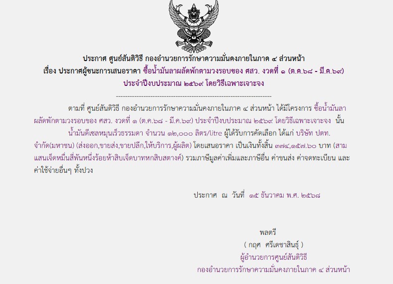 จัดซื้อ จัดจ้างประกาศผู้ชนะการเสนอราคา ประกาศผู้ชนะการเสนอราคา ซื้อน้ำมันลาผลัดพักตามวงรอบของ ศสว. งวดที่ ๑ (ต.ค.๖๘ – มี.ค.๖๙) ประจำปีงบประมาณ ๒๕๖๙ โดยวิธีเฉพาะเจาะจง December 15, 2025 10 Share Facebook Twitter Google+ Telegram LINE
