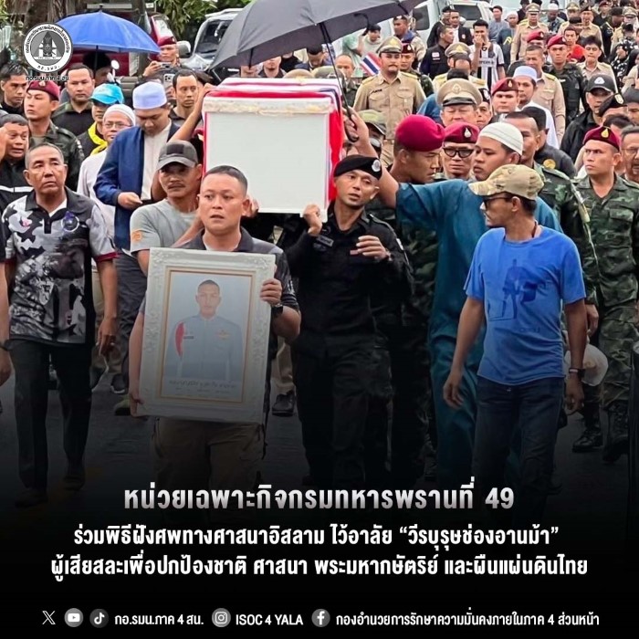 เมื่อวันที่ 14 ธันวาคม 2568 เวลา 16.30 น. หน่วยเฉพาะกิจกรมทหารพรานที่ 49 จัดกำลังพล ร่วมพิธีฝังศพทางศาสนาอิสลาม เพื่อไว้อาลัยและสดุดีการเสียสละของ พลอาสาสมัคร มุสตากีม มาเจ๊ะมะ ตำแหน่ง พลยิงอาวุธต่อสู้รถถัง สังกัด กองพันจู่โจม หน่วยบัญชาการสงครามพิเศษ ผู้ได้รับการยกย่องเป็น “วีรบุรุษช่องอานม้า” พิธีดังกล่าวจัดขึ้น ณ กุโบร์บ้านสุแฆ หมู่ที่ 3 ตำบลดุซงญอ อำเภอจะแนะ จังหวัดนราธิวาส ซึ่งเป็นภูมิลำเนาของผู้เสียชีวิต โดยมี พลตรี ชาคริต อุจะรัตน รองแม่ทัพภาคที่ 4 / รองผู้อำนวยการรักษาความมั่นคงภายในภาค 4 ส่วนหน้า เป็นประธานในพิธี พร้อมด้วย รองผู้บังคับการหน่วยเฉพาะกิจกรมทหารพรานที่ 49 ผู้แทนจากสถานีตำรวจภูธรจะแนะ ส่วนราชการอำเภอจะแนะ ผู้บังคับกองร้อย ผู้นำศาสนา ผู้นำชุมชน องค์กรปกครองส่วนท้องถิ่น มวลชนของหน่วย ตลอดจนพี่น้องประชาชนในพื้นที่เข้าร่วมพิธีอย่างพร้อมเพรียง