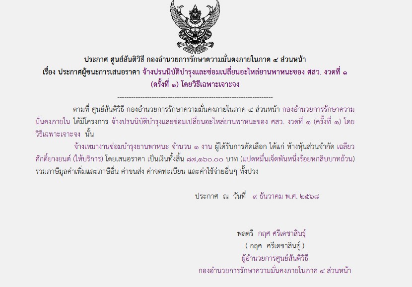 จัดซื้อ จัดจ้างประกาศผู้ชนะการเสนอราคา ประกาศผู้ชนะการเสนอราคา จ้างปรนนิบัติบำรุงและซ่อมเปลี่ยนอะไหล่ยานพาหนะของ ศสว. งวดที่ ๑ (ครั้งที่ ๑) โดยวิธีเฉพาะเจาะจง December 15, 2025 9 Share Facebook Twitter Google+ Telegram LINE
