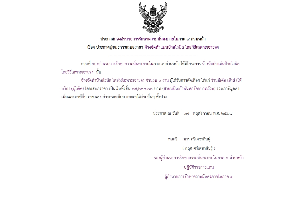 จัดซื้อ จัดจ้างประกาศผู้ชนะการเสนอราคา ประกาศกองอำนวยการรักษาความมั่นคงภายในภาค ๔ ส่วนหน้า เรื่อง ประกาศผู้ชนะการเสนอราคา จ้างจัดทำแผ่นป้ายไวนิล โดยวิธีเฉพาะเจาะจง December 16, 2025 8 Share Facebook Twitter Google+ Telegram LINE