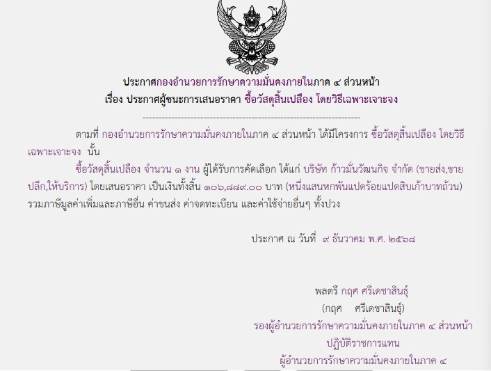 จัดซื้อ จัดจ้างประกาศผู้ชนะการเสนอราคา ประกาศกองอำนวยการรักษาความมั่นคงภายในภาค ๔ ส่วนหน้า เรื่อง ประกาศผู้ชนะการเสนอราคา ซื้อวัสดุสิ้นเปลือง โดยวิธีเฉพาะเจาะจง December 16, 2025 20 Share Facebook Twitter Google+ Telegram LINE