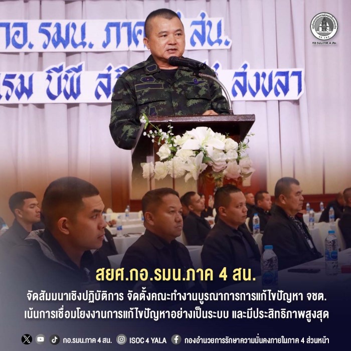 วันที่ 17 ธันวาคม 2568 เวลา 11.00 น. ณ โรงเเรม บีพี สมิหลา บีช โฮเทล แอนด์ รีสอร์ท อ.เมือง จ.สงขลา พลตรี อนุชา โนนคู่เขตโขง ผู้อำนวยการส่วนพัฒนายุทธศาสตร์ กองอำนวยการรักษาความมั่นคงภายในภาค 4 ส่วนหน้า เปิดการประชุมทบทวนติดตาม และประเมินผลการบูรณาการแผนแม่บทภายใต้ยุทธศาสตร์ชาติ สัมมนาเชิงปฏิบัติการ Integration Working Groups (IWG) ปีงบประมาณ 2569 จัดโดยส่วนพัฒนายุทธศาสตร์ กองอำนวยการรักษาความมั่นคงภายในภาค 4 ส่วนหน้า ตามที่ผู้อำนวยการรักษาความมั่นคงภายในภาค 4 ให้ความสำคัญในการบูรณาการขับเคลื่อนการแก้ไขปัญหาจังหวัดชายแดนใต้ ประจำปีงบประมาณ 2569 ซึ่งต้องอาศัยความร่วมมือประสานระหว่างหน่วยต่างๆและมุ่งเน้นการเชื่อมโยงงานการแก้ไขปัญหาที่เกิดขึ้นในพื้นที่ได้อย่างเป็นระบบ และมีประสิทธิภาพสูงสุด โดยนำแนวความคิดการแก้ไขปัญหาในแต่ละประเด็นสำคัญจัดตั้งเป็นคณะทำงานบูรณาการการแก้ไขปัญหาจังหวัดชายแดนภาคใต้ ปีงบประมาณ 2569 Integration Working Groups (IWG)