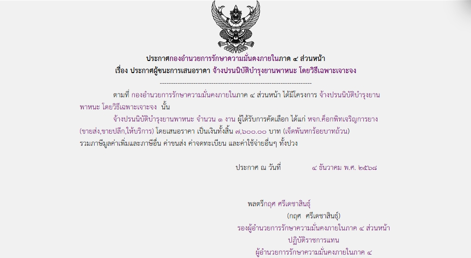 จัดซื้อ จัดจ้างประกาศผู้ชนะการเสนอราคา ประกาศกองอำนวยการรักษาความมั่นคงภายในภาค ๔ ส่วนหน้า เรื่อง ประการผู้ชนะการเสนอราคา จ้างปรนนิบัติบำรุงยานพาหะ โดยวิธีเฉพาะเจาะจง December 17, 2025 5 Share Facebook Twitter Google+ Telegram LINE