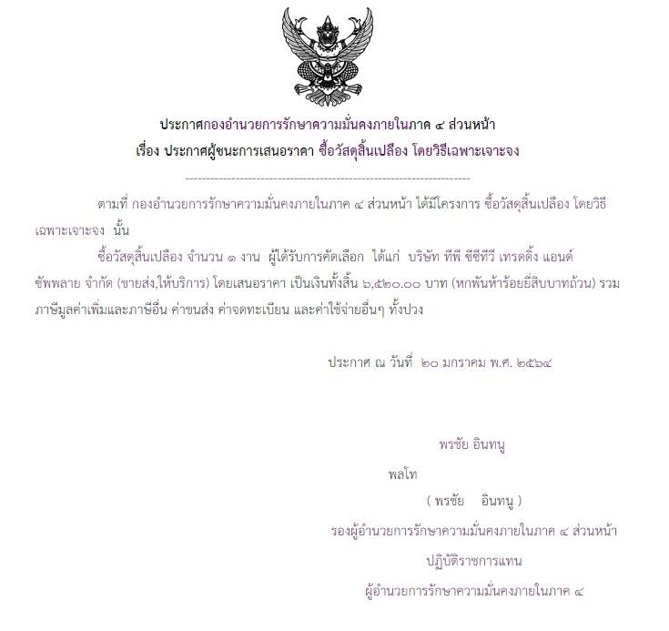 ประกาศผู้ชนะการเสนอราคา ซื้อวัสดุสิ้นเปลือง โดยวิธีเฉพาะเจาะจง ( ๖,๕๒๐.๐๐ บาท )