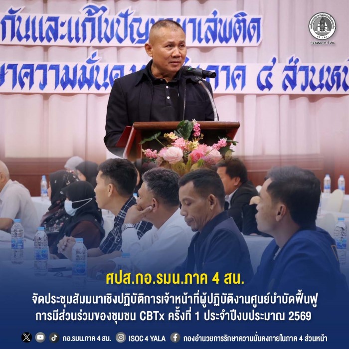 วันที่ 17 ธันวาคม 2568 ที่ ห้องประชุมโรงแรมบีพี สมิหลา บีช โฮเต็ล แอนด์ รีสอร์ท ตำบลบ่อยาง อำเภอเมืองสงขลา จังหวัดสงขลา พลตรี วิธเวช วิเศษศรี ผู้อำนวยการศูนย์ป้องกันและแก้ไขปัญหายาเสพติด กองอำนวยการรักษาความมั่นคงภายในภาค 4 ส่วนหน้า เป็นประธานในพิธีเปิดการประชุมสัมมนาเชิงปฏิบัติการเจ้าหน้าที่ผู้ปฏิบัติงานศูนย์บำบัดฟื้นฟูการมีส่วนร่วมของชุมชน CBTx ครั้งที่ 1 ประจำปีงบประมาณ 2569 โดยมี พันเอก ฉกาจ ร่มแสง รองผู้อำนวยการศูนย์ป้องกันและแก้ไขปัญหายาเสพติด กองอำนวยการรักษาความมั่นคงภายในภาค 4 ส่วนหน้า ให้การต้อนรับ พร้อมด้วย พันโท ณรงค์ศักดิ์ เกตสุวรรณ์ ผู้อำนวยการกองนโยบายและแผน ศูนย์ป้องกันและแก้ไขปัญหายาเสพติด กองอำนวยการรักษาความมั่นคงภายในภาค 4 ส่วนหน้า กล่าววัตถุประสงค์ในการจัดกิจกรรมสัมมนาในครั้งนี้ และเชิญวิทยากรจากสำนักงานป้องกันและปราบปรามยาเสพติดภาค 9, ผู้ใหญ่บ้าน หมู่ 10 ตำบลลำไพล และ พันเอก ปฐพี พุทธผล หัวหน้าฝ่ายโครงการงบประมาณ ศูนย์สันติวิธี กองอำนวยการรักษาความมั่นคงภายในภาค 4 ส่วนหน้า มาบรรยายให้ความรู้ โดยมีเจ้าหน้าที่ผู้ปฏิบัติงานศูนย์บำบัดฟื้นฟูการมีส่วนร่วมของชุมชน CBTx ของจังหวัดสงขลา ,จังหวัดยะลา ,จังหวัดปัตตานี และจังหวัดนราธิวาส เข้าร่วมประชุมสัมมนา อย่างพร้อมเพรียง