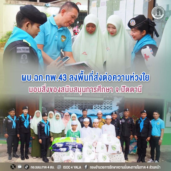 วันที่ 17 ธันวาคม 2568 เวลา 14.00 น. พันเอก ชาญฤทธิ์ ฮันสราช ผู้บังคับหน่วยเฉพาะกิจกรมทหารพรานที่ 43 พร้อมด้วยหัวหน้าฝ่ายกิจการพลเรือนฯ และหมวดทหารพรานหญิง 43 ลงพื้นที่พบปะเยี่ยมเยียนและมอบสิ่งของอุปโภคบริโภคแก่โรงเรียนมูฮัมมาดียะห์ ตำบลนาประดู่ อำเภอโคกโพธิ์ จังหวัดปัตตานี เพื่อแสดงความห่วงใยของหน่วยงานภาครัฐ สร้างความเชื่อมั่น และสนับสนุนการจัดการเรียนการสอน พร้อมให้คำแนะนำและการแจ้งข้อมูลข่าวสารสถานการณ์ในพื้นที่ โดยมีโต๊ะอิหม่ามและคณะครูให้การต้อนรับอย่างอบอุ่น