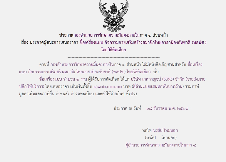 จัดซื้อ จัดจ้างประกาศผู้ชนะการเสนอราคา ประกาศผู้ชนะการเสนอราคา ซื้อเครื่องแบบ กิจกรรมการเสริมสร้างสมาชิกไทยอาสาป้องกันชาติ (ทสปช.) โดยวิธีคัดเลือก December 18, 2025 8 Share Facebook Twitter Google+ Telegram LINE