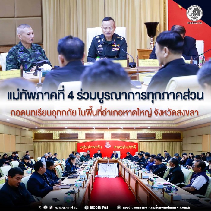 วันที่ 18 ธันวาคม 2568 เวลา 14.30 น. ณ ห้องประชุมมณฑลทหารบกที่ 42 ค่ายเสนาณรงค์ ตำบลคอหงส์ อำเภอหาดใหญ่ จังหวัดสงขลา พลโท นรธิป โพยนอก แม่ทัพภาคที่ 4 / ผู้อำนวยการรักษาความมั่นคงภายในภาค 4 เข้าร่วมประชุมถอดบทเรียนอุทกภัยในพื้นที่อำเภอหาดใหญ่ จังหวัดสงขลา เพื่อแลกเปลี่ยนข้อมูลเชิงลึกและประสบการณ์การบริหารจัดการสถานการณ์จากทุกภาคส่วน ทั้งภาครัฐและภาคเอกชน โดยมี พันตำรวจเอก ประทีป เจริญกัลป์ ผู้ตรวจราชการสำนักนายกรัฐมนตรี เป็นประธานการประชุม พร้อมด้วยหน่วยงานที่เกี่ยวข้องเข้าร่วมอย่างพร้อมเพรียง