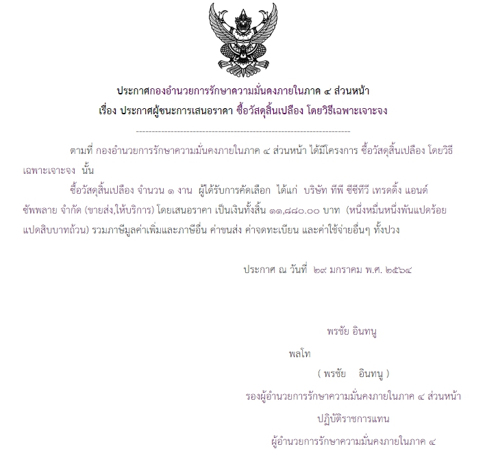 ประกาศผู้ชนะการเสนอราคา ซื้อวัสดุสิ้นเปลือง โดยวิธีเฉพาะเจาะจง ( ๑๑,๘๘๐.๐๐ บาท )
