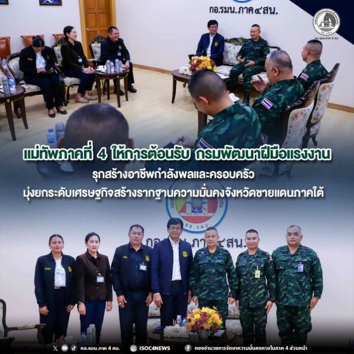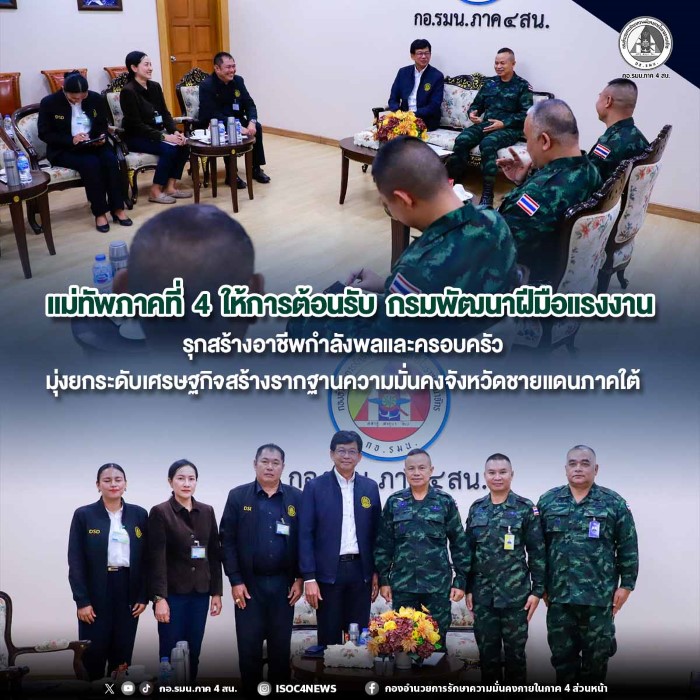 วันนี้ (19 ธันวาคม 2568) เวลา 10.00 น. ที่ห้องรับรอง กองอำนวยการรักษาความมั่นคงภายในภาค 4 ส่วนหน้า ค่ายสิรินธร ตำบลเขาตูม อำเภอยะรัง จังหวัดปัตตานี พลโท นรธิป โพยนอก แม่ทัพภาคที่ 4 / ผู้อำนวยการรักษาความมั่นคงภายในภาค 4 พร้อมด้วยคณะผู้บังคับบัญชา ให้การต้อนรับ นายชาติวุฒิ ทองกัน ผู้ตรวจราชการกรมพัฒนาฝีมือแรงงาน ฃพร้อมด้วยคณะ เพื่อปรึกษาหารือแนวทางในการปฏิบัติงานร่วมกันอย่างพร้อมเพรียง