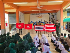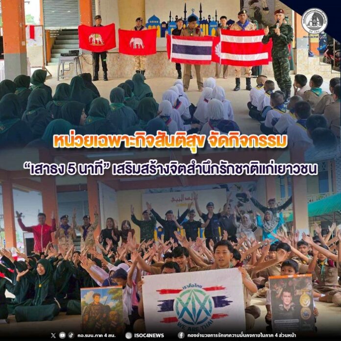 หน่วยเฉพาะกิจสันติสุข โดย ชุดสันติสุขที่ 405 ร่วมกับ ชุดทักษิณสัมพันธ์ที่ 441, กองร้อยทหารพรานนาวิกโยธินที่ 5 และ อาสาสมัครชุดคุ้มครองตำบลลุโบะสาวอ จัดกิจกรรม “เสาธง 5 นาที” เพื่อปลูกฝังอุดมการณ์ความรักชาติและความภาคภูมิใจในความเป็นไทยให้แก่นักเรียน
