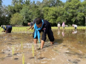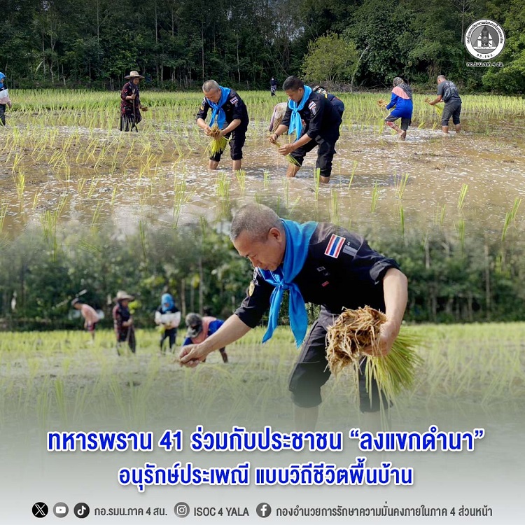 เมื่แวันที่ 20 ธันวาคม 2568 เวลา 09.30 น. หน่วยเฉพาะกิจกรมทหารพรานที่ 41 โดย ผู้บังคับกองร้อยทหารพรานที่ 4102 พร้อมด้วยกำลังพล ชุดปฏิบัติการกิจการพลเรือน ร่วมกับ ผู้นำชุมชน, ผู้นำท้องถิ่น และประชาชนในพื้นที่ ร่วมกิจกรรมลงแขกดำนาปลูกข้าวในพื้นที่แปลงนาสาธิตเกษตรชุมชน เพื่อส่งเสริมการเรียนรู้ด้านอาชีพให้กับเกษตรกร พร้อมทั้งสืบทอดวัฒนธรรม อนุรักษ์วิถีชีวิตชาวนา และสร้างความสามัคคีภายในชุมชน ณ แปลงนาสาธิตเกษตรชุมชน ศูนย์การเรียนรู้เศรษฐกิจพอเพียงตำบลฯ บ้านตะโล๊ะหะลอ หมู่ที่ 2 ตำบลตะโล๊ะหะลอ อำเภอรามัน จังหวัดยะลา