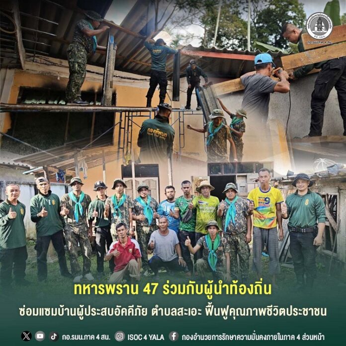 หน่วยเฉพาะกิจกรมทหารพรานที่ 47 โดยกองร้อยทหารพรานที่ 4714 มอบหมายให้รองผู้บังคับกองร้อยทหารพรานที่ 4714 ร่วมกับกำนันตำบลสะเอะ ,ผู้นำชุมชน ,องค์การบริหารส่วนตำบลสะเอะ และชุดคุ้มครองตำบลสะเอะ บูรณาการความร่วมมือเข้าปรับปรุงและซ่อมแซมที่พักอาศัยของประชาชนผู้ประสบเหตุอัคคีภัย ซึ่งได้รับความเสียหายและความเดือดร้อน เพื่อบรรเทาความทุกข์ยากและช่วยฟื้นฟูสภาพความเป็นอยู่ให้กลับคืนสู่ภาวะปกติโดยเร็ว ณ บ้านเลขที่ 106/1 บ้านกะดูโด๊ะ หมู่ที่ 3 ตำบลสะเอะ อำเภอกรงปินัง จังหวัดยะลา