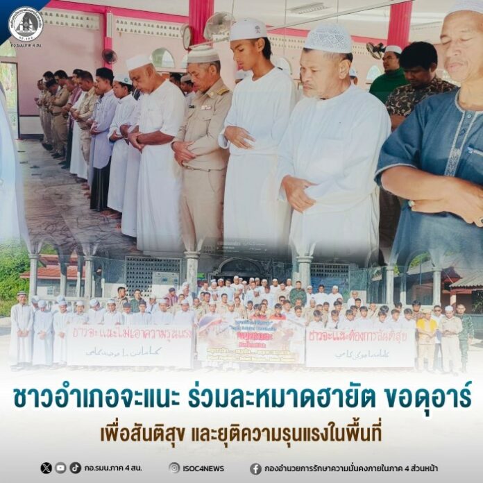 วันที่ 22 ธันวาคม 2568 เวลา 08.00 น. หน่วยเฉพาะกิจกรมทหารพรานที่ 49 ร่วมกับส่วนราชการอำเภอจะแนะ, ผู้นำท้องที่, ผู้นำท้องถิ่น ผู้นำศาสนา , องค์กรปกครองส่วนท้องถิ่น มวลชนของหน่วย และประชาชนในพื้นที่ตำบลดุซงญอ อำเภอจะแนะ จังหวัดนราธิวาส ร่วมประกอบพิธีละหมาดฮายัต และดุอาร์ขอพรจากพระผู้เป็นเจ้า (อัลลอฮฺ ซ.บ.) ณ มัสยิดตัรบียาตุลตะลีมียะห์ หมู่ที่ 6 บ้านกาเต๊าะ ตำบลดุซงญอ อำเภอจะแนะ จังหวัดนราธิวาส ภายหลังเกิดเหตุคนร้ายลอบยิงสมาชิกกองอาสารักษาดินแดนอำเภอจะแนะ ส่งผลให้เจ้าหน้าที่เสียชีวิต สร้างความสะเทือนใจแก่ประชาชนในพื้นที่เป็นอย่างยิ่ง