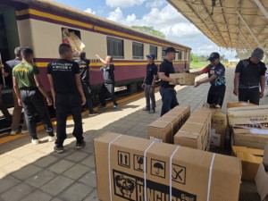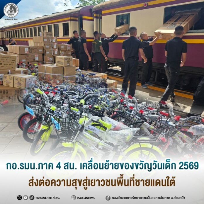 วันนี้ (24 ธันวาคม 2568) ที่สถานีรถไฟโคกโพธิ์ อำเภอโคกโพธิ์ จังหวัดปัตตานี สำนักมวลชนและกิจการพิเศษ กองอำนวยการรักษาความมั่นคงภายในภาค 4 ส่วนหน้า ได้ดำเนินการเคลื่อนย้ายของขวัญเนื่องในโอกาสวันเด็กแห่งชาติ ประจำปี 2569 เพื่อเตรียมนำไปมอบให้แก่เด็กและเยาวชนในพื้นที่จังหวัดชายแดนภาคใต้