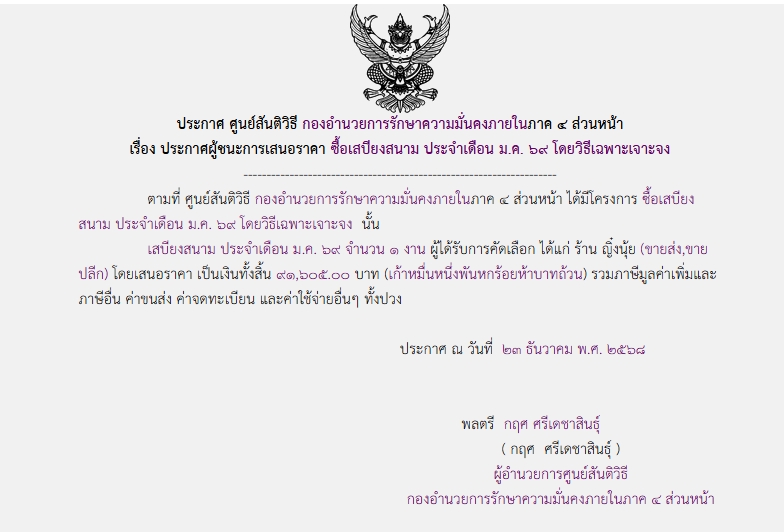 จัดซื้อ จัดจ้างประกาศผู้ชนะการเสนอราคา ประกาศผู้ชนะการเสนอราคา ซื้อเสบียงสนาม ประจำเดือน ม.ค. ๖๙ โดยวิธีเฉพาะเจาะจง December 25, 2025 8 Share Facebook Twitter Google+ Telegram LINE