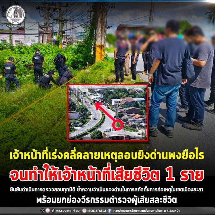 จากกรณีเหตุคนร้ายใช้อาวุธปืนลอบยิงบริเวณด่านตรวจพงยือไร อำเภอเมือง จังหวัดยะลา ส่งผลให้ ดาบตำรวจสังเวียน แก้วเพชร อายุ 48 ปี ผู้บังคับหมู่กองกำกับการตำรวจตระเวนชายแดนที่ 43 เสียชีวิตในที่เกิดเหตุ เมื่อเวลาประมาณ 21.35 น. ของวันที่ 22 ธันวาคม 2568 โดยเจ้าหน้าที่ได้รับแจ้งว่าเกิดเหตุอาวุธปืนลั่นขณะทำความสะอาดอาวุธปืน และได้รีบนำตัวส่งห้องฉุกเฉิน โรงพยาบาลศูนย์ยะลา แต่แพทย์ตรวจพบว่าไม่มีสัญญาณชีพ และเสียชีวิต ณ ที่เกิดเหตุ พบรอยกระสุนปืนบริเวณเบ้าตาด้านขวา ลักษณะกระสุนไม่ทะลุ โดยภายหลังเกิดเหตุ เจ้าหน้าที่ได้ดำเนินการตามขั้นตอนทางกฎหมายอย่างรัดกุม โดยนำร่างผู้เสียชีวิตส่งไปผ่าชันสูตรพลิกศพโดยแพทย์นิติเวช ณ โรงพยาบาลสงขลานครินทร์ จังหวัดสงขลา เพื่อหาสาเหตุการเสียชีวิตอย่างละเอียดและเป็นธรรม