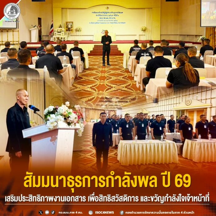 โดยการสัมมนาในครั้งนี้จัดขึ้นโดย สำนักบริหารงานบุคคล กองอำนวยการรักษาความมั่นคงภายในภาค 4 ส่วนหน้า ระหว่างวันที่ 26 – 28 ธันวาคม 2568 โดยมีวัตถุประสงค์หลักเพื่อให้เจ้าหน้าที่ผู้ปฏิบัติงานธุรการมีความเชี่ยวชาญในสายงาน สามารถดำเนินงานด้านเอกสาร สิทธิกำลังพล และการจัดการฐานข้อมูลได้อย่างถูกต้องแม่นยำ ซึ่งถือเป็นฟันเฟืองสำคัญในการสนับสนุนภารกิจรักษาความมั่นคงในพื้นที่