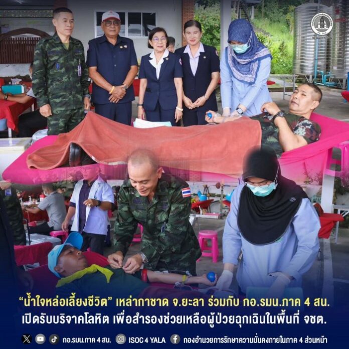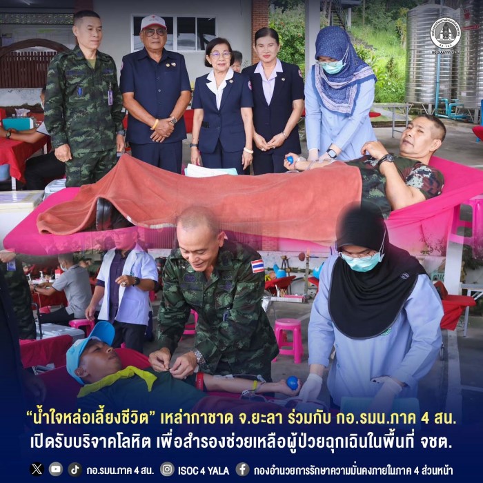 วันนี้ (26 ธันวาคม 2568) เวลา 09.00น. เหล่ากาชาดจังหวัดยะลา และโรงพยาบาลยะลา ร่วมกับ กองอำนวยการรักษาความมั่นคงภายในภาค 4 ส่วนหน้า จัดกิจกรรมรับบริจาคโลหิตประจำปี 2568 เพื่อสำรองโลหิตให้เพียงพอสำหรับช่วยเหลือผู้ป่วยและผู้ประสบเหตุฉุกเฉินในพื้นที่จังหวัดยะลาและจังหวัดใกล้เคียง โดยมี ผู้บังคับบัญชา กำลังพล จิตอาสา และเจ้าหน้าที่ กองอำนวยการรักษาความมั่นคงภายในภาค 4 ส่วนหน้า เข้าร่วมบริจาคโลหิต ณ แหล่งรวมรถ กองอำนวยการรักษาความมั่นคงภายในภาค 4 ส่วนหน้า