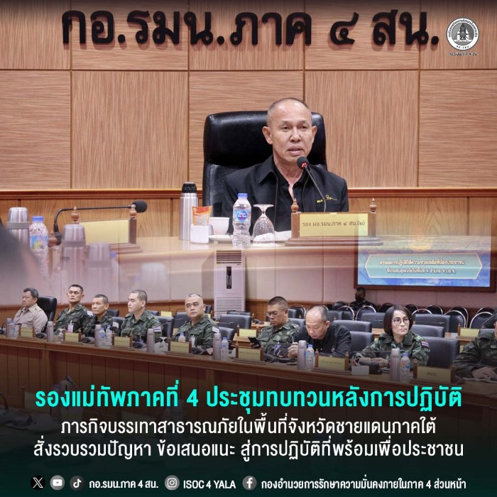 วันนี้ (26 ธันวาคม 2568) เวลา 13.30 น. ที่ห้องประชุม 1 กองอำนวยการรักษาความมั่นคงภายในภาค 4 ส่วนหน้า ค่ายสิรินธร ตำบลเขาตูม อำเภอยะรัง จังหวัดปัตตานี พลตรี กรกฎ ภู่โชติ รองแม่ทัพภาคที่ 4 / รองผู้อำนวยการรักษาความมั่นคงภายในภาค 4 ส่วนหน้า เป็นประธานการประชุม พร้อมด้วยผู้บังคับบัญชาทุกส่วนที่เกี่ยวข้อง เข้าร่วมประชุม ทบทวนหลังการปฏิบัติ การบรรเทาสาธารณภัยในพื้นที่จังหวัดชายแดนภาคใต้ เพื่อสรุปผลการดำเนินงานและวางแนวทางรองรับสถานการณ์ภัยพิบัติในอนาคต โดยมีการประชุมร่วมกับหน่วยงานในพื้นที่ด้วยระบบทางไกลผ่านจอภาพ