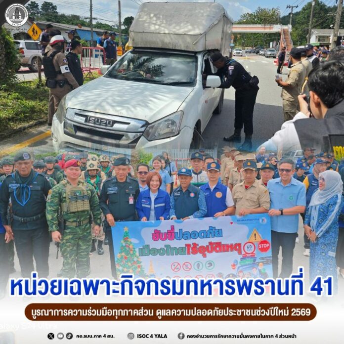 เมื่อวันที่ 30 ธันวาคม 2568 พันตรี ลิขิต กระฉอดนอก เสนาธิการหน่วยเฉพาะกิจกรมทหารพรานที่ 41 ได้จัดกำลังพล ร่วมบูรณาการกับส่วนราชการในพื้นที่ เข้าร่วมพิธีเปิดการป้องกันและลดอุบัติเหตุทางถนนช่วงเทศกาลปีใหม่ พ.ศ. 2569 ภายใต้โครงการ “ขับขี่ปลอดภัย ลดความเร็ว ลดอุบัติเหตุ” ซึ่งจัดขึ้นระหว่างวันที่ 30 ธันวาคม 2568 – 5 มกราคม 2569 โดยมี นายจรูญศักดิ์ หมาดเท่ง นายอำเภอรามัน เป็นประธานในพิธี ณ จุดตรวจและจุดบริการประชาชนในพื้นที่ อำเภอรามัน จังหวัดยะลา เพื่ออำนวยความสะดวก ดูแลความปลอดภัย และลดความเสี่ยงจากอุบัติเหตุทางถนนให้แก่ประชาชนและผู้ใช้เส้นทางในช่วงเทศกาลสำคัญ