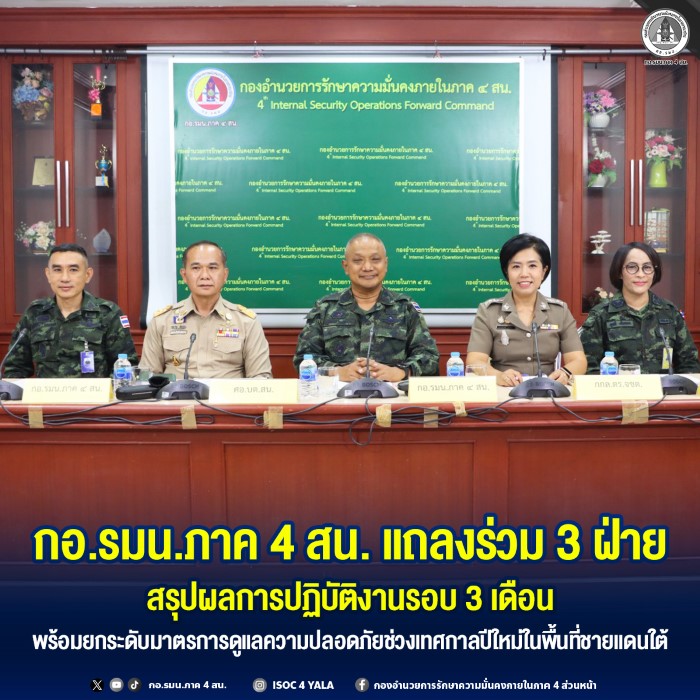วันนี้ (30 ธันวาคม 2568) เวลา 16.00 น. ที่ศูนย์ประชาสัมพันธ์ กองอำนวยการรักษาความมั่นคงภายในภาค 4 ส่วนหน้า ได้จัดการแถลงข่าวสรุปผลการปฏิบัติงานของกองอำนวยการรักษาความมั่นคงภายในภาค 4 ส่วนหน้า และหน่วยขึ้นตรง ในรอบ 3 เดือน ตั้งแต่เดือนตุลาคม ถึงเดือนธันวาคม 2568 เพื่อรายงานผลการดำเนินงาน และสื่อสารข้อมูลที่ถูกต้อง เป็นรูปธรรม และเป็นเอกภาพ ผ่านสื่อมวลชนไปยังพี่น้องประชาชน โดยมี ผู้แทนหน่วยงานที่เกี่ยวข้องเข้าร่วม ประกอบด้วย พันเอก ยุทธนาม เพชรม่วง โฆษกกองอำนวยการรักษาความมั่นคงภายในภาค 4 ส่วนหน้า, ว่าที่พันตำรวจเอกหญิงเสาวลักษณ์ ตรีมรรค หัวหน้างานกิจการพลเรือน กองกำลังตำรวจจังหวัดชายแดนใต้, นาวาเอกจักรพงษ์ อภิมหาธรรม ผู้อำนวยการกองบริหารยุทธศาสตร์การพัฒนาจังหวัดชายแดนภาคใต้ ศูนย์อำนวยการบริหารจังหวัดชายแดนภาคใต้ และพันเอกหญิง ผุสดี เต็มยอด รองโฆษกกองอำนวยการรักษาความมั่นคงภายในภาค 4 ส่วนหน้า พร้อมด้วย พันเอก เอกวริทธิ์ ชอบชูผล หัวหน้าศูนย์ประชาสัมพันธ์ / รองโฆษก กองอำนวยการรักษาความมั่นคงภายในภาค 4 ส่วนหน้า